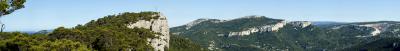 On peut apercevoir la carrière de calcaire du Revest-les-Eaux, dont on extrait du granulat et au loin sur la gauche, les rochers de La Ciotat.